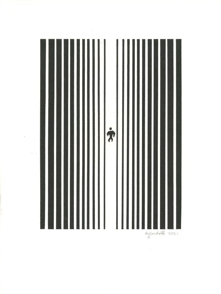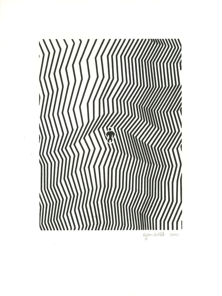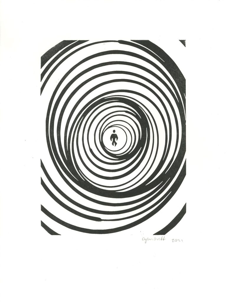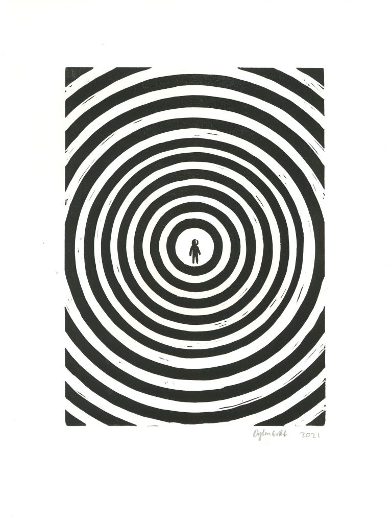 This body of work is an optics study inspired by artists like Bridget Riley and Victor Vasarely of the Op Art movement. Each piece is a linocut print exploring themes of human perception, illusion, and reality. While also pulling from compositional and stylistic choices that mimic animation styles like that of Pink Panther in The Pink Phink.