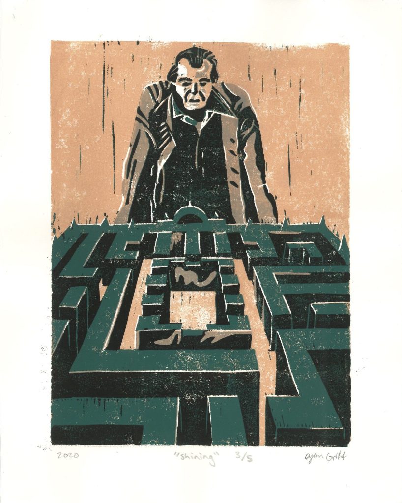 Inspired by some of Stanley Kubrick’s iconic films, these four color reduction linocuts create an image from from a single block by continually carving more away between each layer before printing. It’s one of the most interesting printing processes asking, “What can I take away to reveal more?”